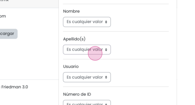 Se mostrarán todos los campos del perfil, cada uno con una lista de opciones para refinar la búsqueda, incluyendo: contiene, no contiene, es igual a, no es igual a, comienza con, termina con, está vacío, no está vacío.