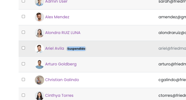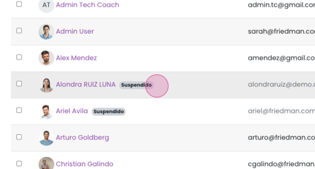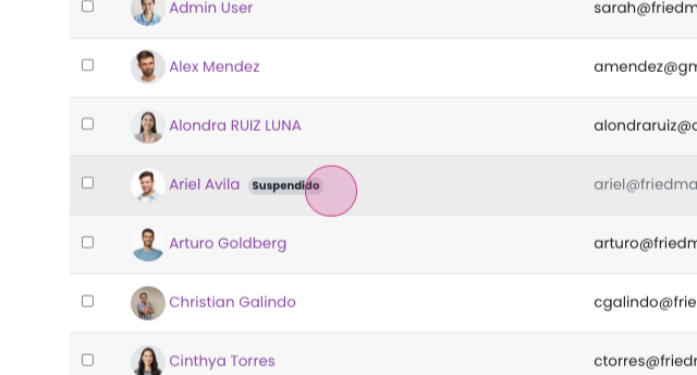 Puedes identificar a los usuarios suspendidos por una etiqueta junto a su nombre, que se mostrará en un color diferente. Los usuarios suspendidos ya no forman parte de la organización; sin embargo, conservar su registro es esencial para generar estadísticas.