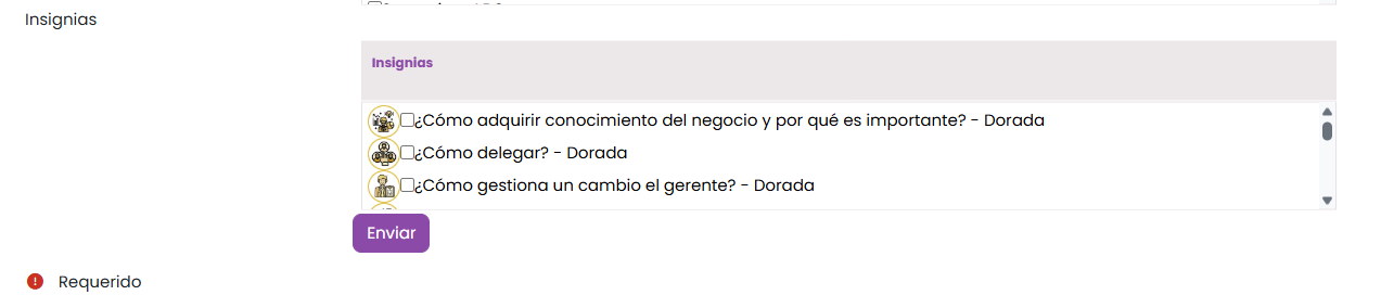 Insignia. Selecciona si el colaborador debe tener una insignia específica para poder comprar el artículo. Certificación laboral. Completitud de un conjunto de cursos.