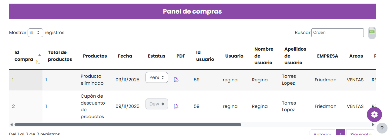 En la parte superior encontrarás la opción Panel de compras, donde podrás ver un reporte con los datos de todas las compras realizadas: