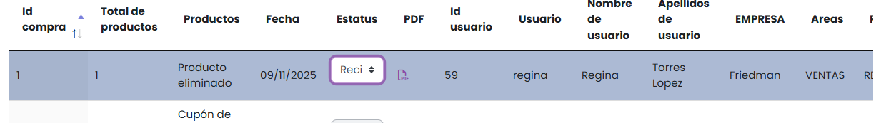 Estatus de la compra que el usuario de Super Admin puede actualizar: pendiente, enviado, recibido