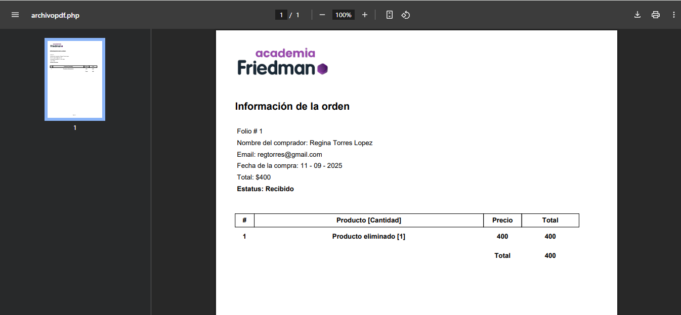 PDF con el resumen detallado de la compra (descargable o imprimible).
