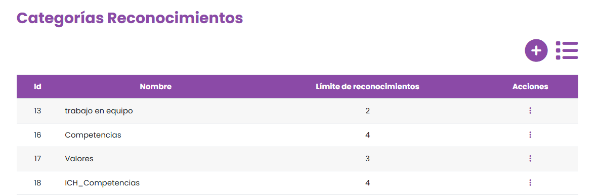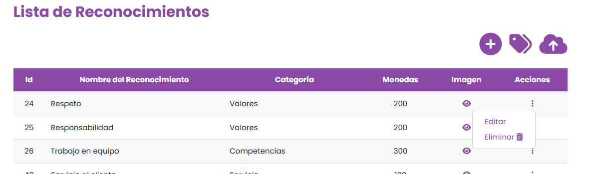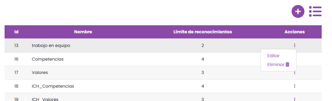 - En la columna de acciones, haz clic en los tres puntos junto al reconocimiento deseado para editarlo o eliminarlo.