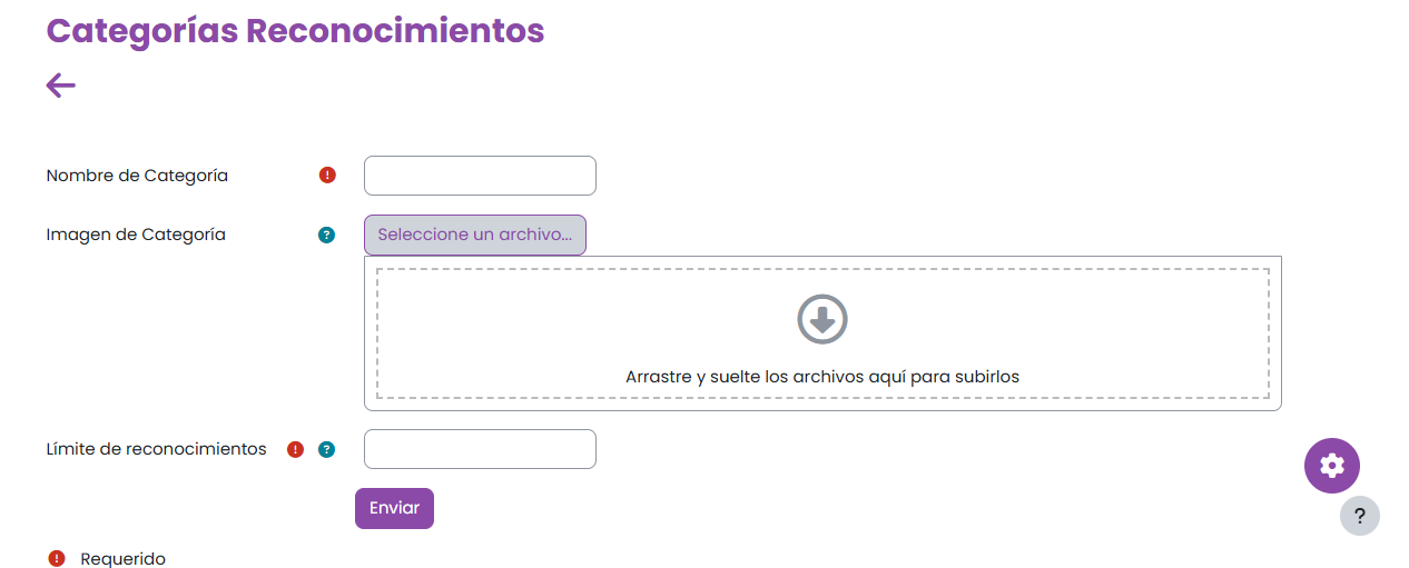 - Llena los siguientes campos: - *Nombre de categoría*: Escribe el nombre correspondiente. - *Imagen de la categoría*: Adjunta una imagen representativa. - *Límite de reconocimientos*: Define el máximo de reconocimientos permitidos en esa categoría. - Haz clic en Enviar para guardar.