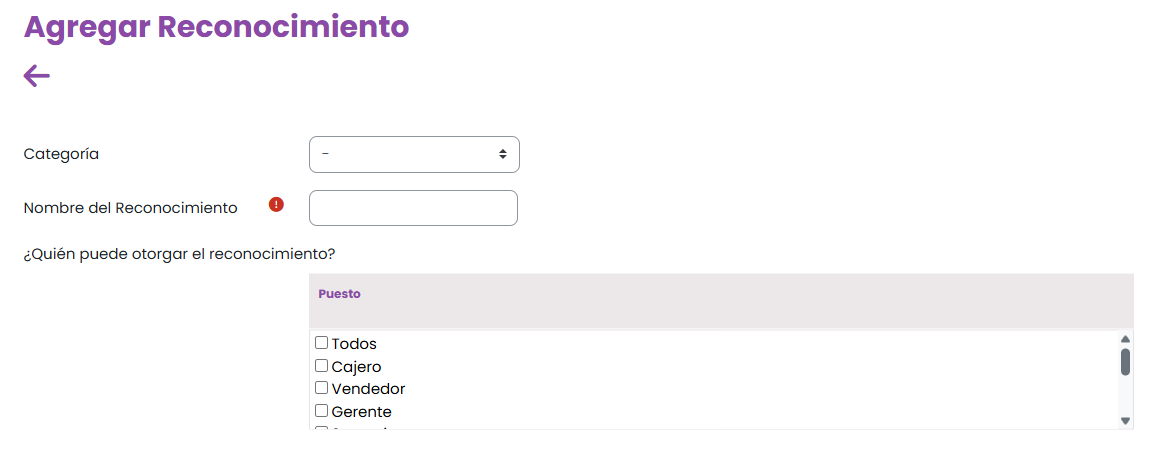 - Para crear un nuevo reconocimiento, selecciona el botón de más arriba a la derecha. - Completa la información: -