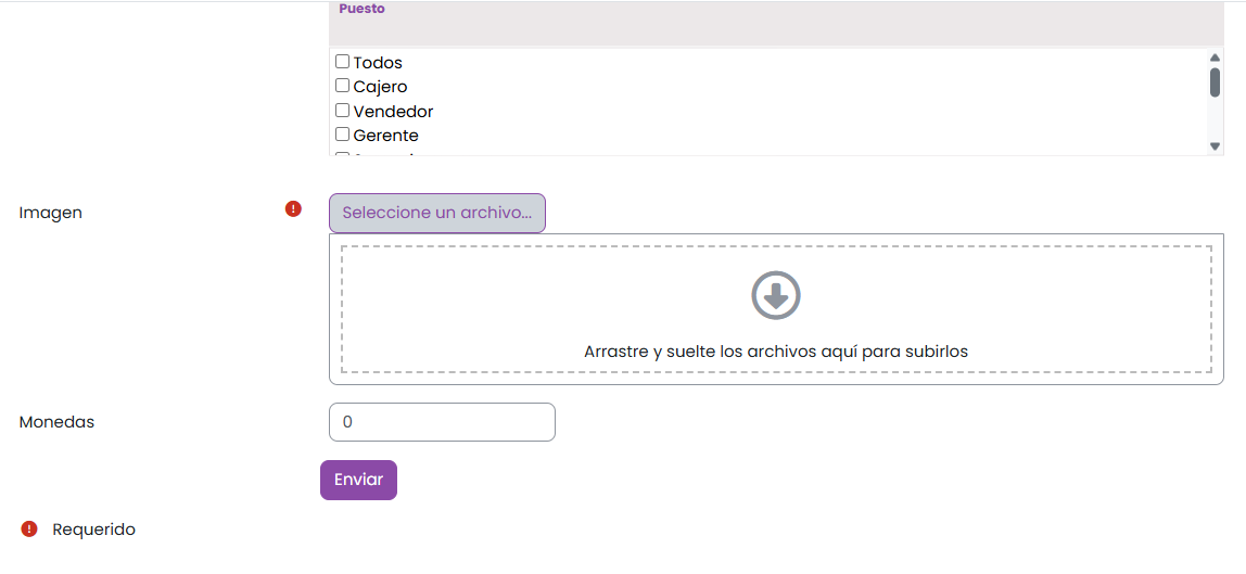 *Categoría*: Escoge la categoría adecuada. - *Nombre del reconocimiento*: Brinda un título identificador. - *¿Quién puede otorgarlo?*: Selecciona los puestos autorizados. - *¿Quién puede recibirlo?*: Indica los puestos destinatarios. - *Imagen*: Adjunta la imagen del reconocimiento. - *Monedas*: Configura si otorga monedas para la tienda en línea. - Haz clic en Enviar.