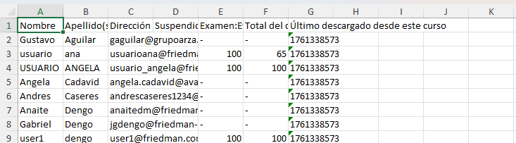 Paso 11: El archivo contendrá los nombres, apellidos, correo y promedio obtenido por los usuarios antes importados. Elimina la última columna de últimas descargas, dirección, email y total del curso.
